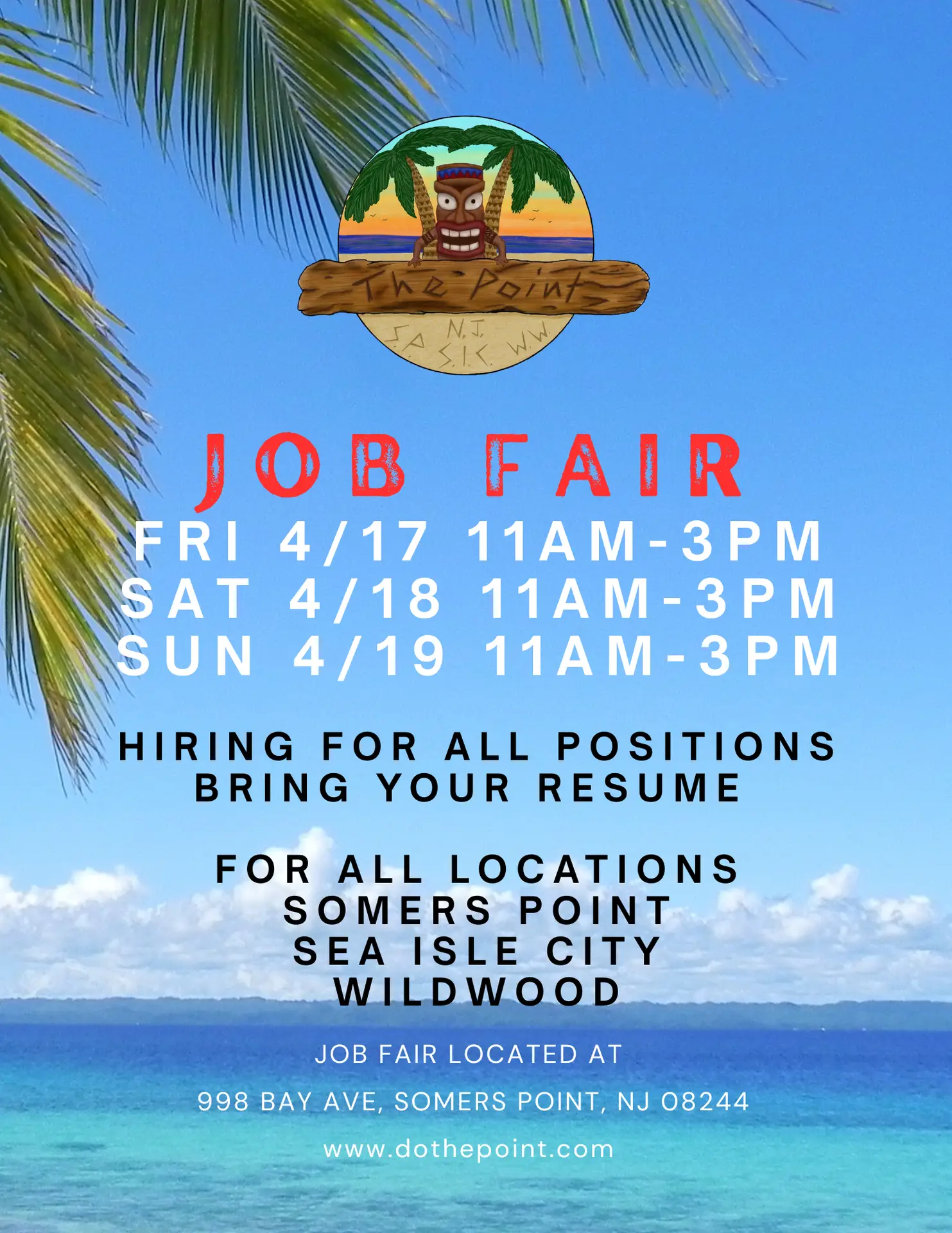 We will be taking applications and holding interviews at our Somers Point location 4/17-4/19 from 11am-3pm. We are hiring for all locations and all postions. Bartender, Bar Back, Server, Runner, Busser, Cook, Security, Expediter, Cleaners and Managers. |